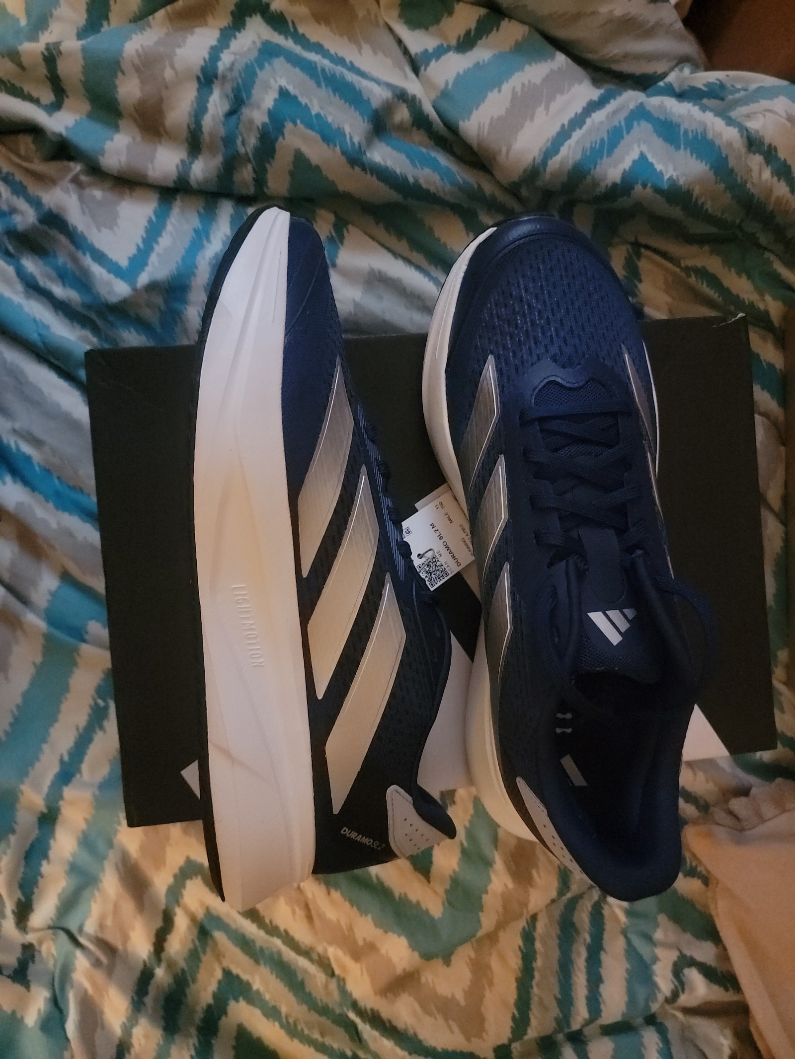 Brand New With Box. Men's 11.5 Adidas Duramo SL.2 M Running sneakers. Navy/silver Adidas stripes/ grey/ white light motion bottoms with Ortholite insoles for comfort. These could fit a woman 12.5