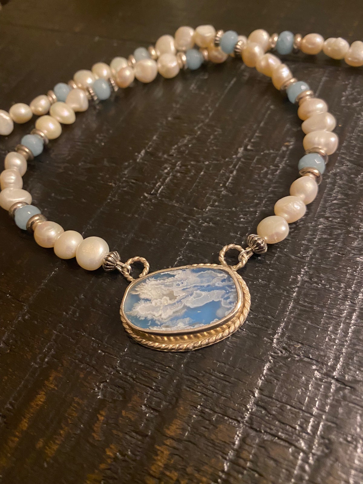 The main stone on the pendant connector is a doublet Plume Agate set in sterling silver 925