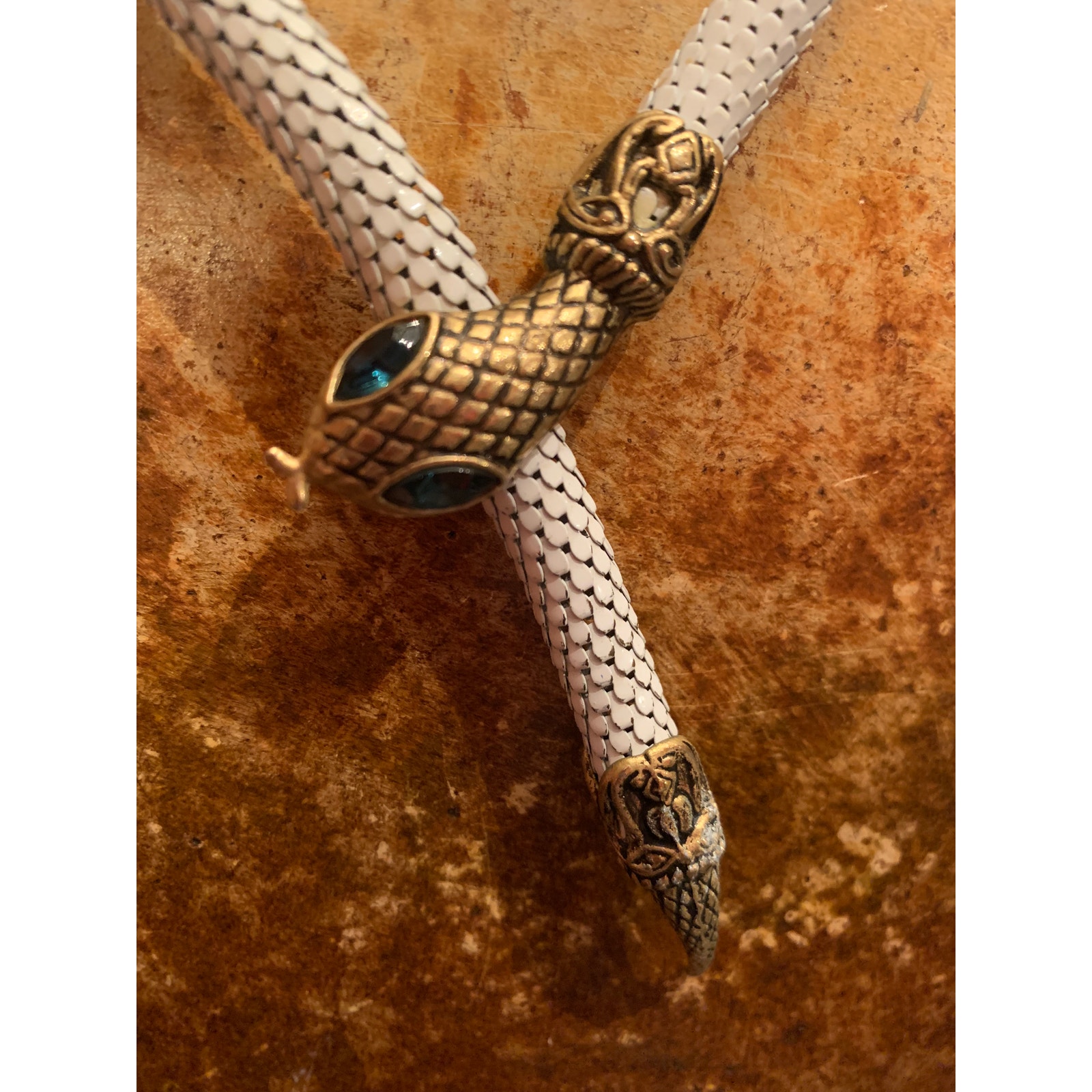 Gorgeous, eclectic and unique white enamel blue eyed snake belt or necklace by DL Auld, Vintage. Gold tone findings with black details and white enamel metal mesh that resembles scales. Head has clip that snaps down on white mesh. Measures 40 inches long and .40 inches wide. If worn as a belt would fit 36 inches or smaller. Love it wrapped as a necklace. Hallmarked DL Auld. In almost perfect condition.