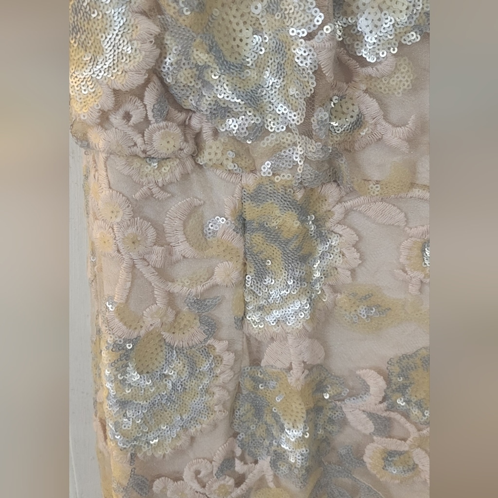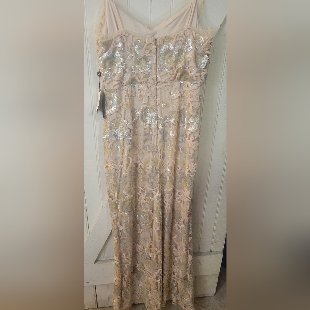 Adrianna Papell Sequin Floral Embroidered Organza Blouson Gown with sheer mesh.
